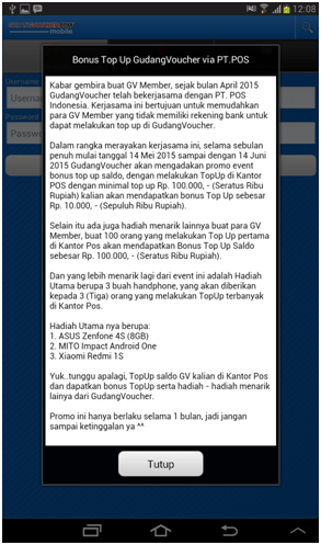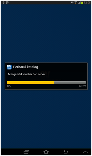 - Ketika pertama kali aplikasi dijalankan, maka aplikasi akan melakukan Update Catalog (Perbarui Katalog). Jika update berhasil maka aplikasi akan menampilkan halaman Login dan berita terbaru dari GudangVoucher.com .