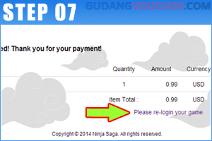 Transaksi pembayaran akan tampil, kemudian pilih "Please re-login your game" untuk masuk kembali ke dalam Ninja Saga.