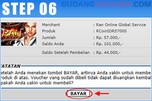 Pada halaman konfirmasi akan tampil tagihan yang akan mengurangi saldo Anda di GudangVoucher. Kemudian klik "Bayar" untuk melakukan pembayaran atas transaksi Anda.