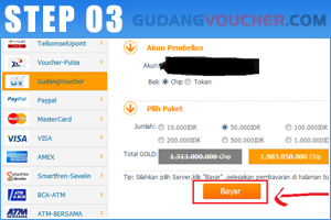 Pada kolom "Pilih Saluran Pembelian" pilih logo GudangVoucher. Kemudian pilih nilai paket yang diinginkan dan pilih "Bayar".