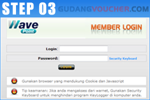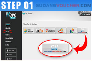 Login ke website Wave Point dengan akun Anda. Kemudian pilih menu "Top Up" dan pilih logo "GudangVoucher".